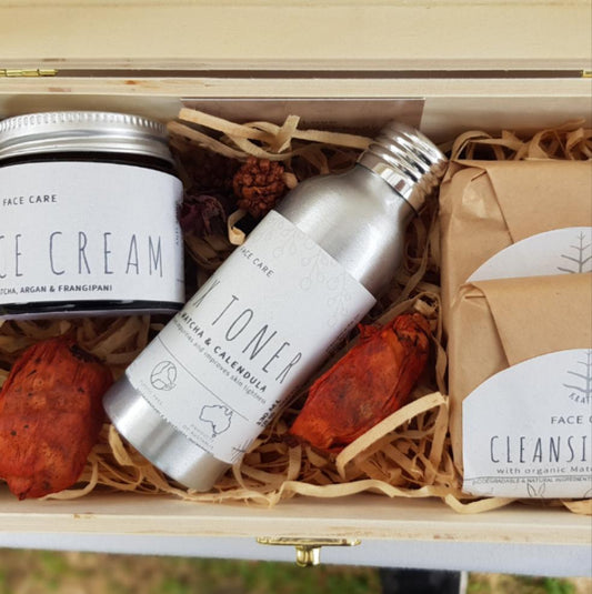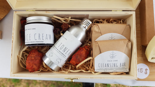 NATURAL FACE CARE GIFT BOX - cleansing bar, exfoliating bar, anti-aging cream & detox toner